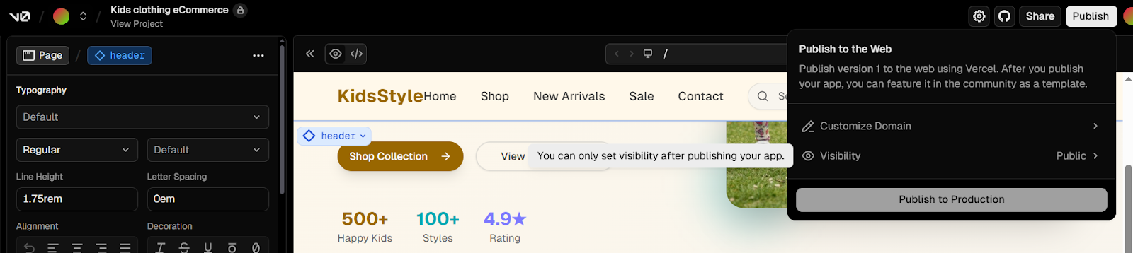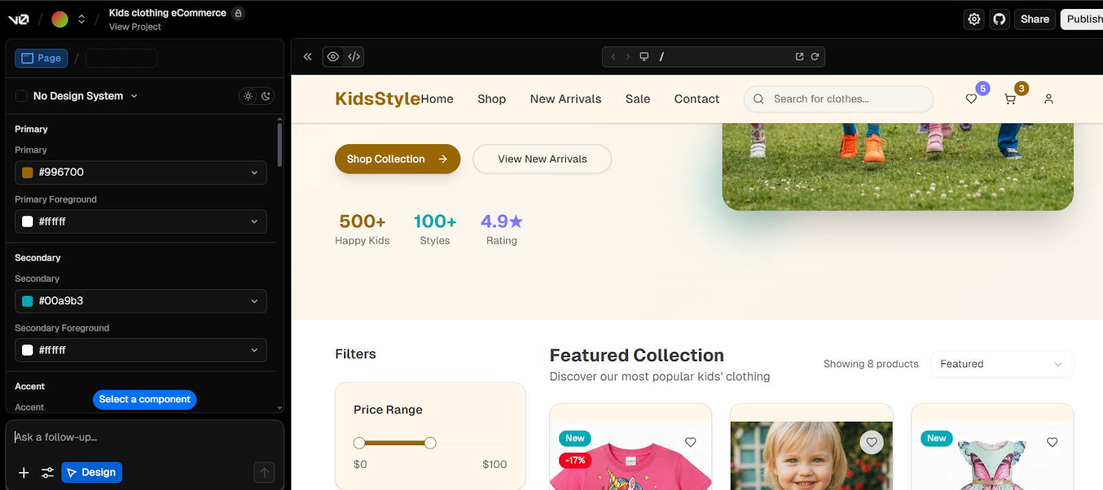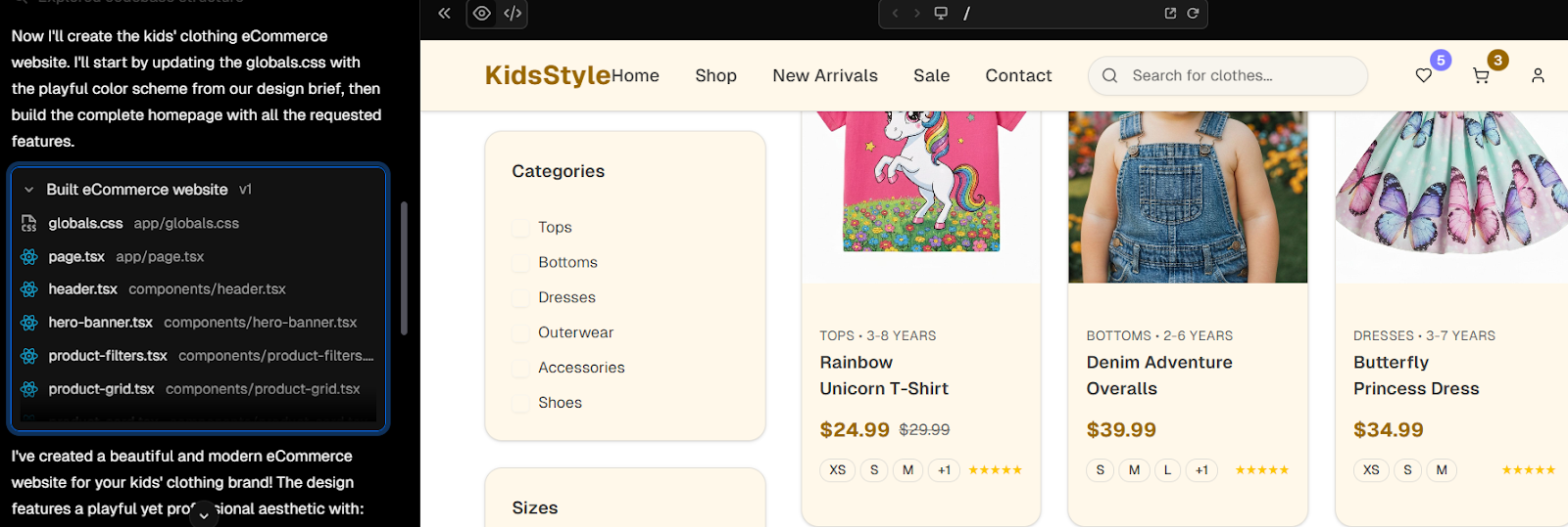 Developers type what they want, for example, create a clean eCommerce website for a kids clothing brand.