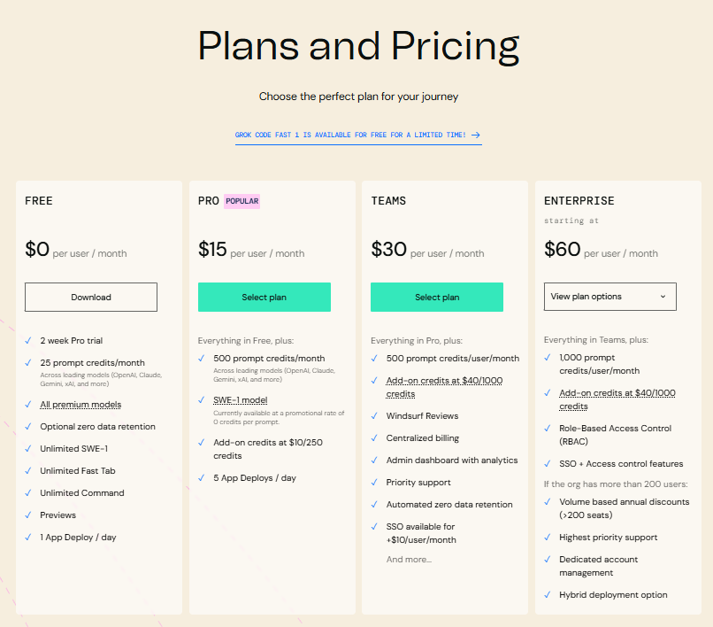 Free | $0/month | 25 prompt credits/month, 2-week Pro trial, unlimited SWE-1 & Fast Tab access, 1 app deployment/day, optional zero data retention |